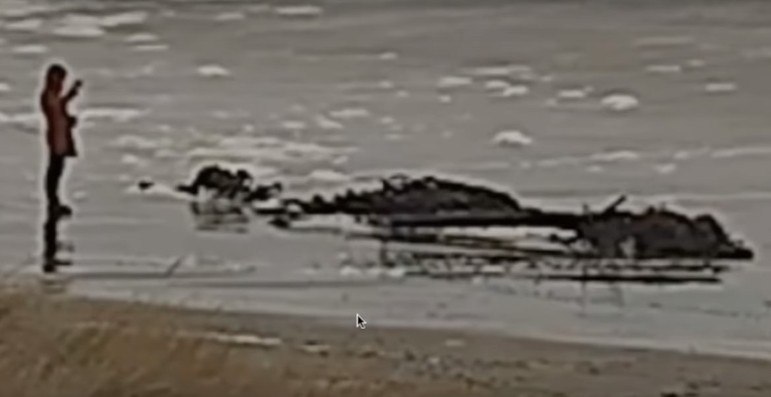 Nelas, vemos os restos da criatura parados na areia, enquanto visitantes se aproximam e tiram fotos